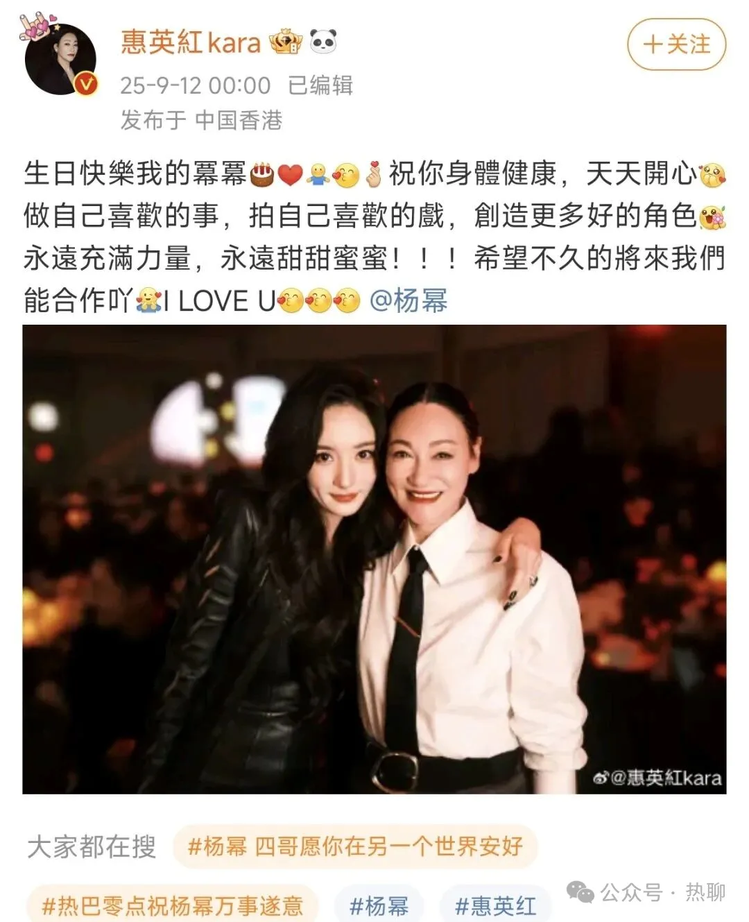 Veteran actress Kara Wai (惠英红) shared a touching birthday message alongside a sweet photo with Yang Mi, writing: “Do what you love, act in the dramas you love, create more great characters, always stay strong, always stay sweet.” She also expressed hopes for a future collaboration. Though the two haven’t officially worked together, their close bond is clearly evident.