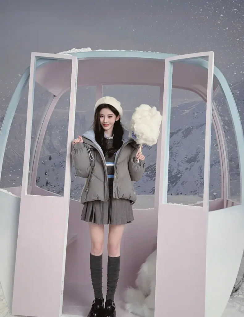 Ju Jingyi’s ensemble exhibited a delightful mix of casual and chic elements. The down jacket, a staple for colder months, paired beautifully with the preppy mini-skirt, presenting a modern take on winter attire. This unique pairing not only underlined her slender legs but also added an element of sophistication to her outfit. The choice of a beret complemented her look, reinforcing a playful yet glamorous vibe.