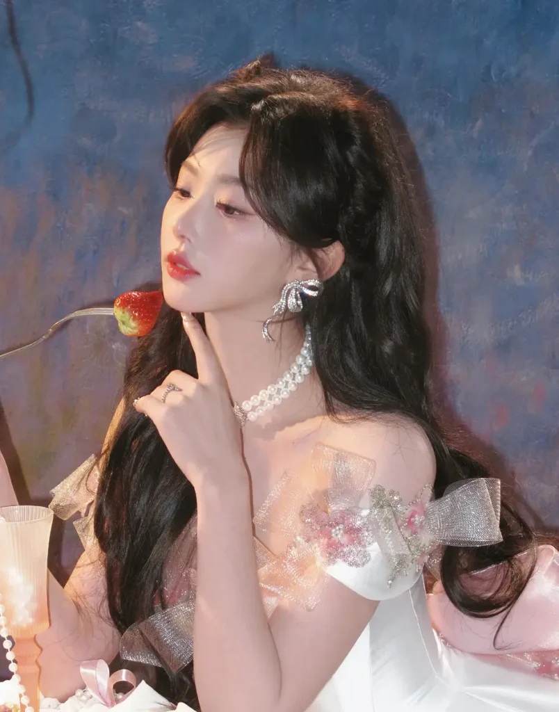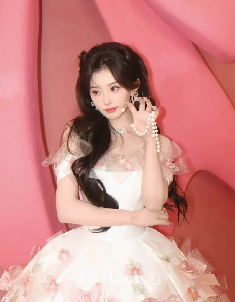 Kong Xueer’s makeup is nothing short of flawless, accentuating her natural beauty while creating an air of sophistication. She complements her look with charming bow earrings and a pearl necklace, symbols of grace and femininity. These accessories elevate her ensemble, adding layers of elegance and sweetness.