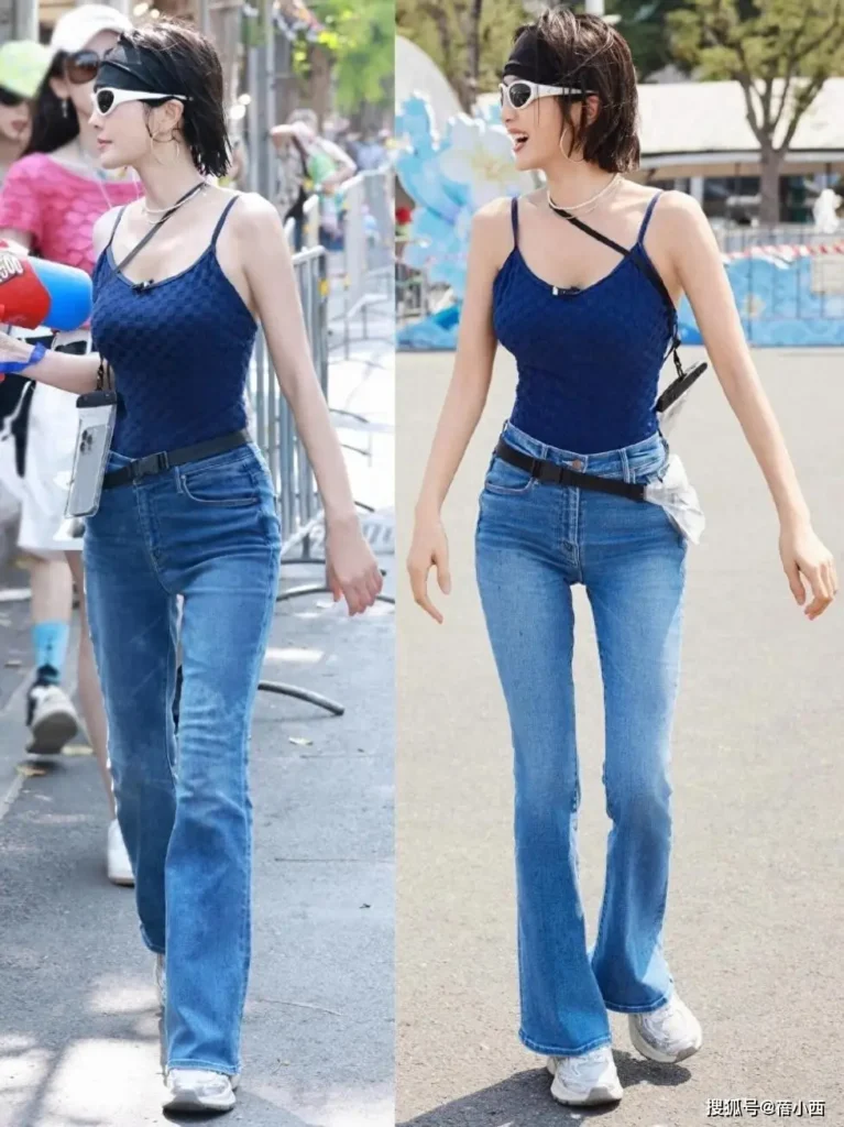 Qin Lan paired her camisole with blue flared jeans, a trendy silhouette that enhances leg lines and works best on those with a lean upper leg. The gradual widening from the knee down helps balance proportions, even if the calves carry slightly more volume. In summer, camisoles pair well with sandals, slippers, or breathable casual shoes, offering both comfort and style.