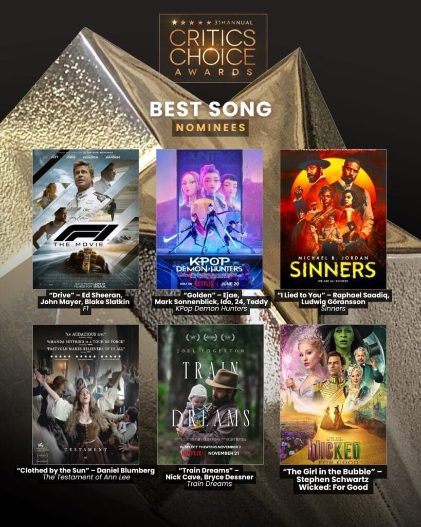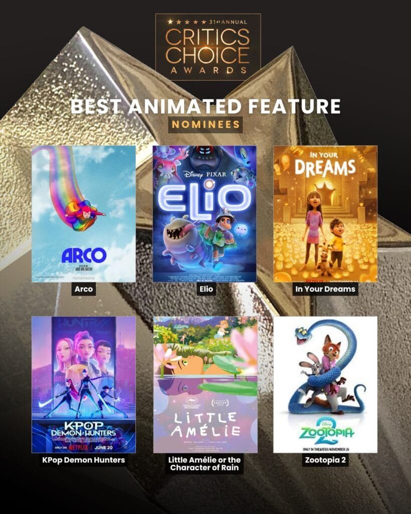 “KPop Demon Hunters” continues its impressive award-season run with two nominations at the 31st annual Critics Choice Awards.