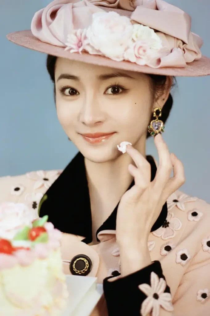 In her birthday photos, Zhou Jieqiong wore a pastel pink outfit that accentuated her radiant charm. The ensemble was brought to life with a delightful floral hat, lending an air of retro-sweet elegance. This choice of clothing not only highlighted her figure but also paid homage to vintage aesthetics that resonate well with her youthful spirit. The careful coordination of colors and patterns truly made her ensemble eye-catching.