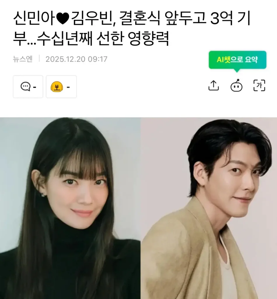 Recent reports suggest that actors Kim Woo Bin and Shin Min Ah have made a year-end donation totaling approximately 300 million won to support socially vulnerable groups. The funds are said to have been distributed to several organizations, including the Hallym Burn Foundation, Asan Medical Center in Seoul, and other charitable institutions, continuing the couple’s long-standing commitment to philanthropy.