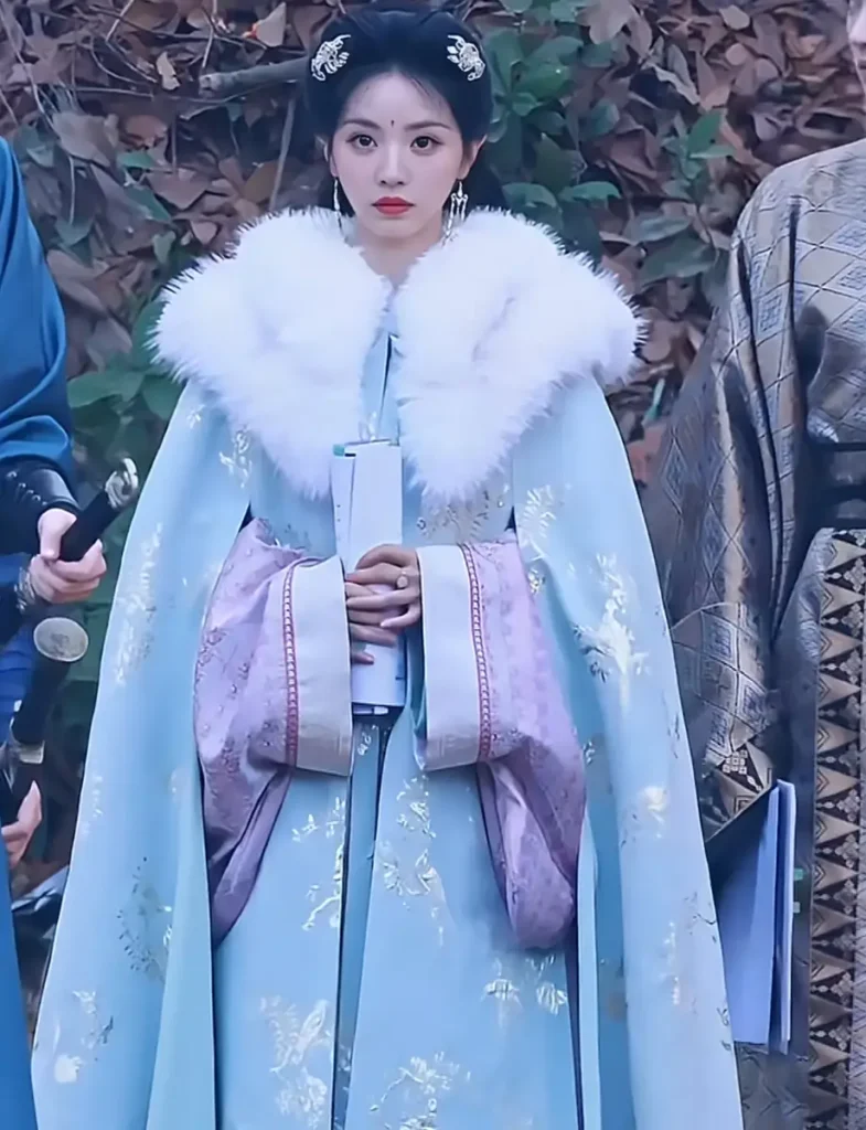 Tian Xiwei’s outfit features a light blue ancient costume that radiates brightness and liveliness. The choice of color complements her overall look, making her stand out. Additionally, the white fox fur collar adds a touch of sophistication, emphasizing her fashionable style. Together, these elements not only enhance her beauty but also accentuate her unique cool temperament.