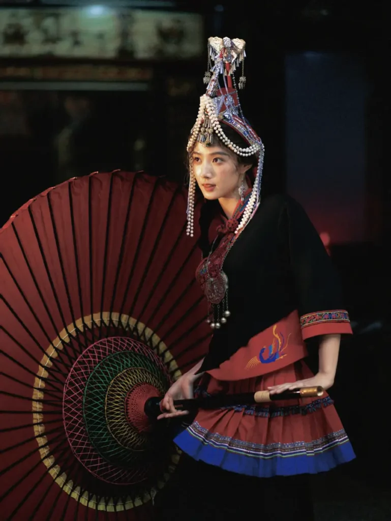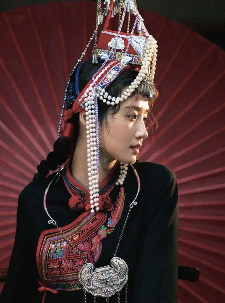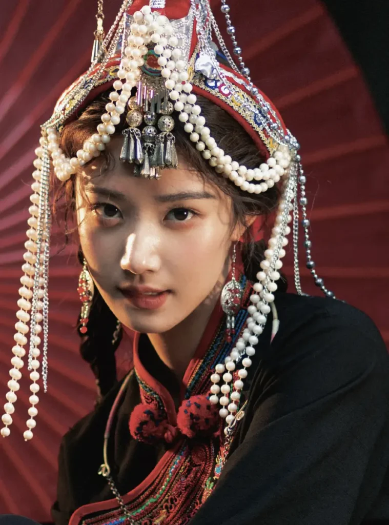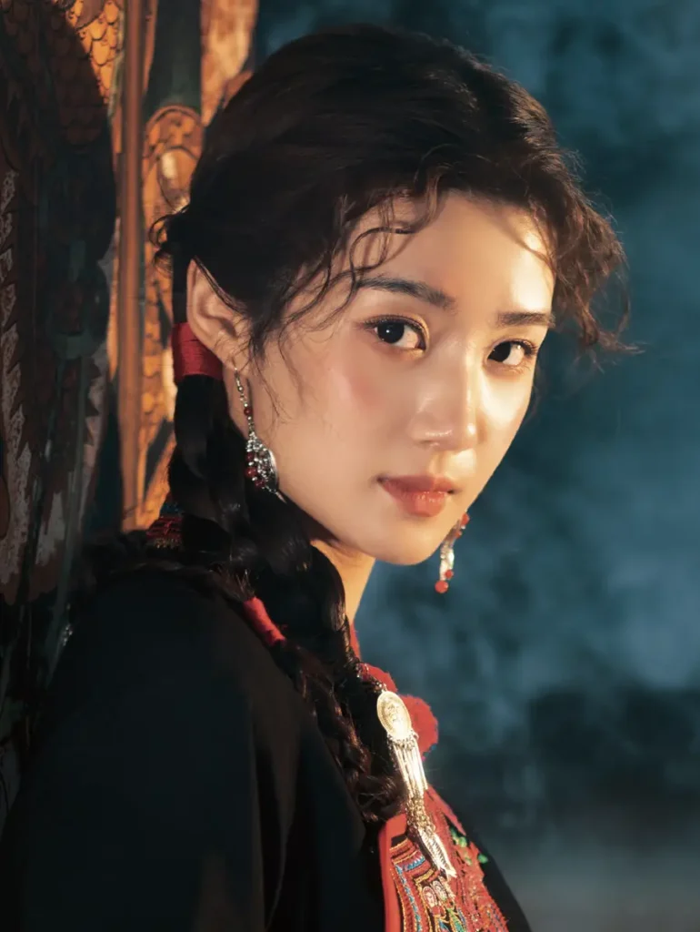 Rather than emphasizing dramatic styling, the photo series focuses on a calm and natural atmosphere. Lu Yuxiao’s relaxed posture and expressive gaze allow the costume to feel less ceremonial and more connected to everyday life. This sense of ease helps bridge the gap between traditional ethnic fashion and modern visual storytelling.