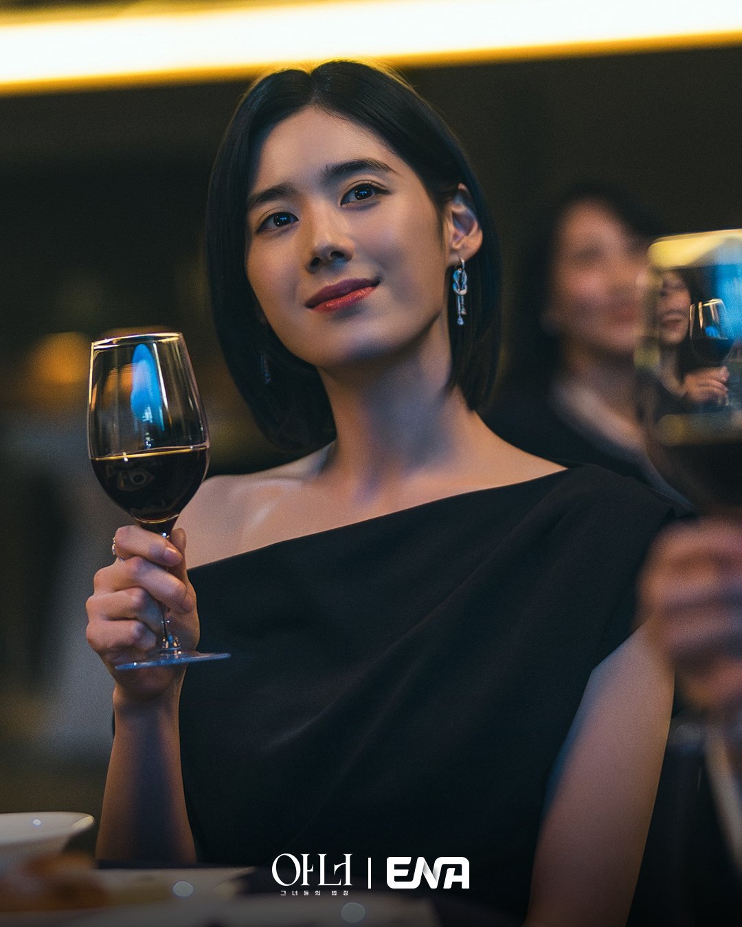 The newly released stills highlight different facets of the character. Dressed in a sleek suit, Kang Shin Jae’s steady gaze conveys authority and composure in the face of pressure. In contrast, scenes showing her at social gatherings, holding a wine glass with a relaxed smile, reflect the refinement shaped by her upbringing. Meanwhile, her focused expression while working underscores sharp intelligence and professional credibility.