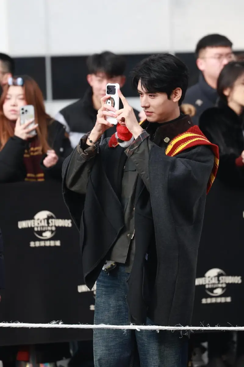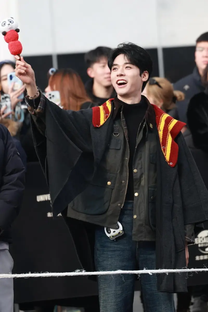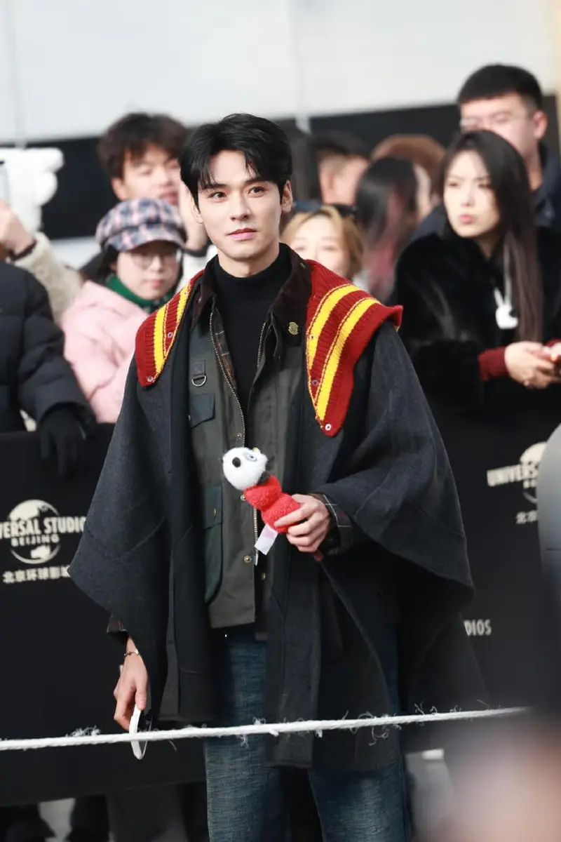 Gong Jun was seen wearing a black wizard-style robe, a look that blended seamlessly with the park’s fantasy setting and contrasted with his usual polished public image. In his hand, he carried a “Kung Fu Panda” plush toy, a small detail that added a sense of humor and childlike charm to the scene.