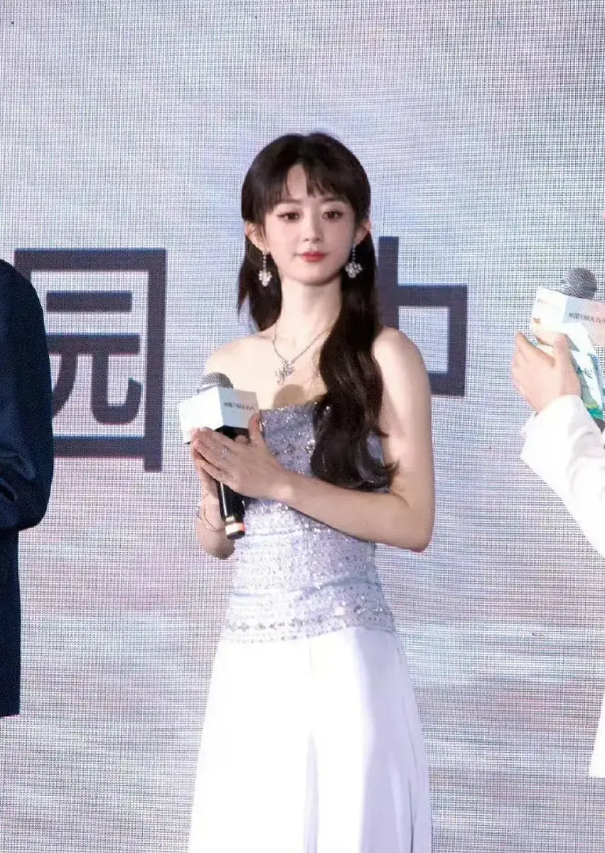 Zhao Liying styled her hair with straight bangs and chose a fresh, understated makeup look. Her gentle smile added warmth to the overall appearance, giving the outfit an approachable and composed feel. The strapless design emphasized her neckline and shoulders, balancing elegance with a subtle sense of modern style.