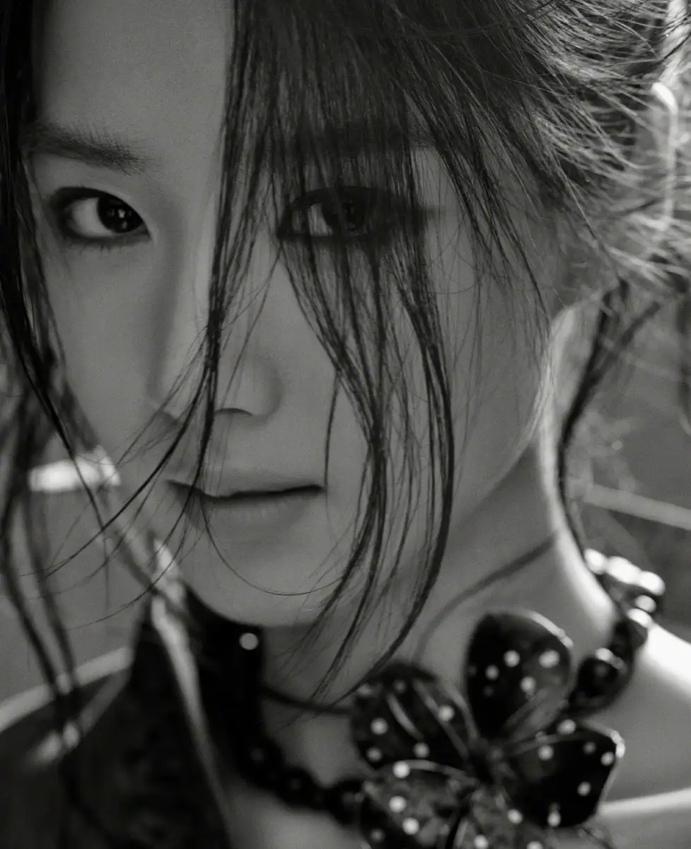 In one set, Lu Yuxiao appears in a loose denim jacket worn half-open, creating a relaxed yet confident silhouette. The styling emphasizes simplicity and freedom, highlighting her natural charisma. Another black-and-white close-up focuses on atmosphere, with slightly tousled hair and a composed expression that add a sense of mystery. The retro and floral-themed images lean toward softness and movement, allowing her expressive side to come through while maintaining a strong visual identity.