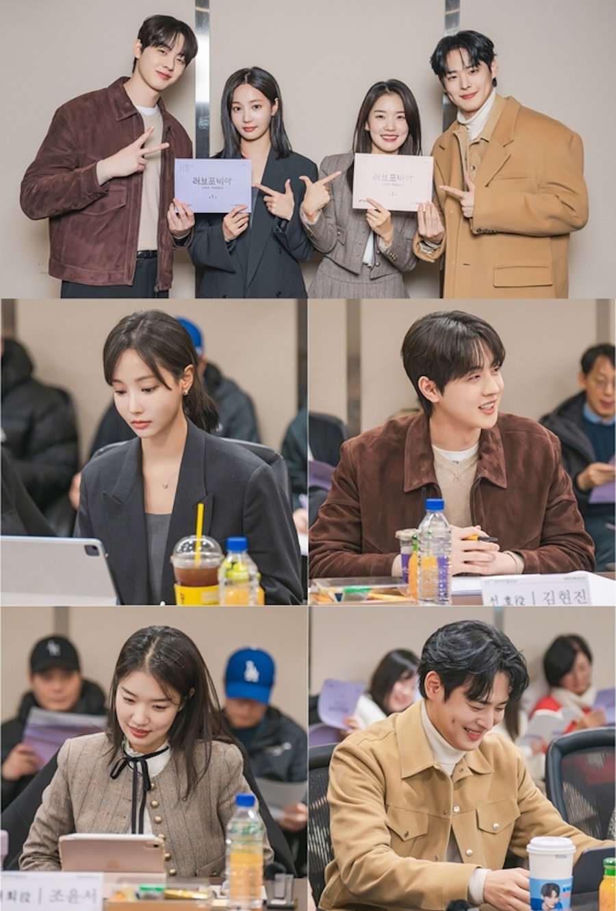 U+tv’s upcoming drama “Love Phobia” has released a glimpse of its first script reading session, offering an early look at the atmosphere of the production. The series tells the story of Han Sun Ho (Kim Hyun Jin), a romance novelist who is deeply in touch with his emotions, and Yoon Bi Ah (Yeonwoo), the emotionally reserved CEO of the AI-powered dating app “It’s You.” When their paths cross, the two gradually come to understand each other and begin a journey toward finding love.