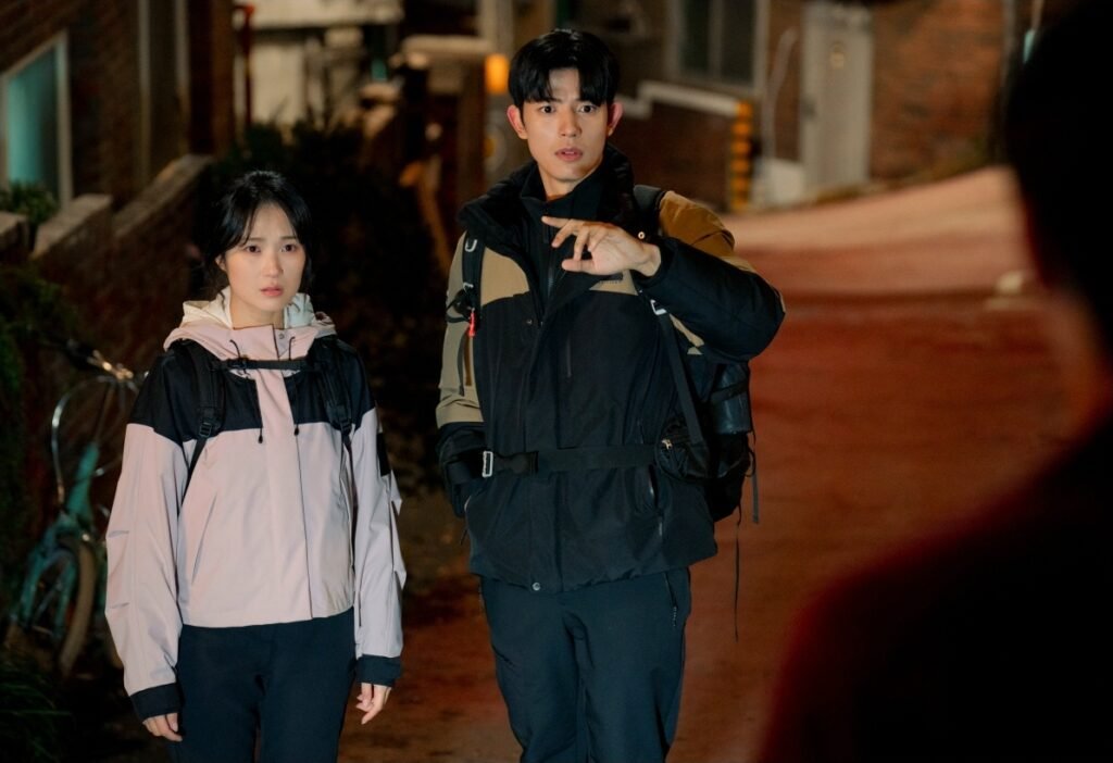 The newly released stills show Eun Ho and Kang Si Yeol returning home after their search, only to realize that they are not alone. One image captures the pair looking visibly shocked upon spotting someone waiting in the alley outside Si Yeol’s house. Another reveals that the mysterious woman they encountered at Seoraksan—who closely resembles Geum Ho, the gumiho Eun Ho believed had died centuries ago—has followed them back.
