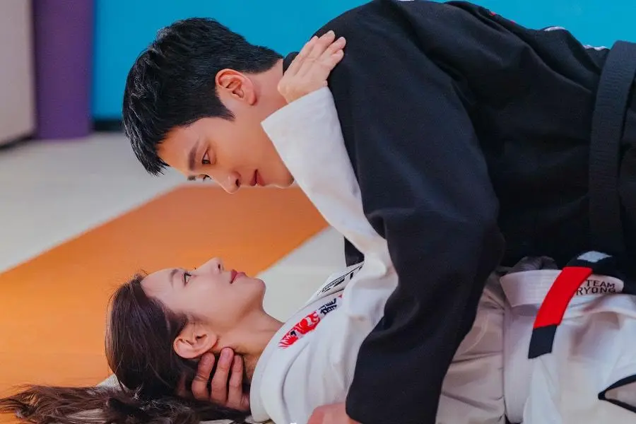 In the newly unveiled stills, Seon Jae Gyu and Yoon Bom are seen enjoying a jiu jitsu date. Seon Jae Gyu gently ties Yoon Bom’s uniform belt, and the two grow closer under the guise of training, sharing relaxed smiles that heighten the warm atmosphere of the dojo.