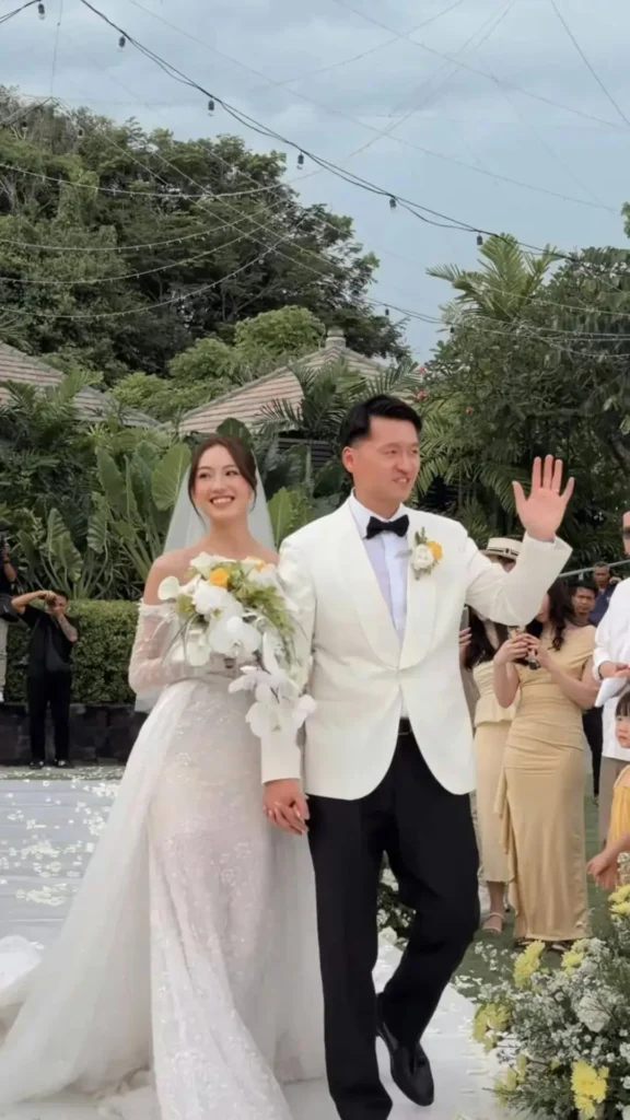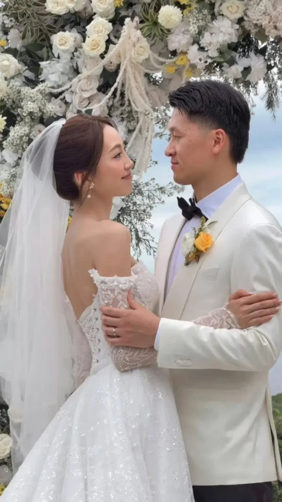 Following the traditional rites, Katy Yeung changed into a white low-cut wedding gown for a Western-style ceremony held at an outdoor seaside venue in Bali. Surrounded by clear skies, blue waters, and family and friends, the couple exchanged vows in a romantic setting. Her 178-centimeter height and model-like proportions stood out in the wedding visuals, while her tall husband complemented her appearance.