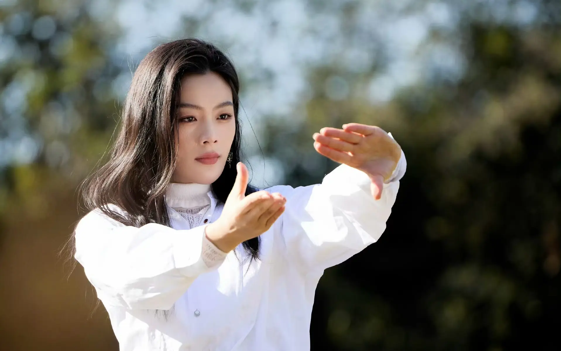 A recent outdoor photo series featuring Chen Lijun has drawn attention for its relaxed yet striking aesthetic. Dressed in a crisp white shirt paired with black leather pants, she presents a look that feels both effortless and refined, set against the calm backdrop of open grass and trees.