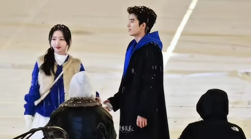 In the released images, Deng Enxi and Wang Xingyue were seen walking side by side through the snow, their interactions appearing natural and close. Snowflakes resting on their hair added a romantic touch to the atmosphere. At times, they playfully teased each other, sharing bright smiles that heightened the sweet mood on set.