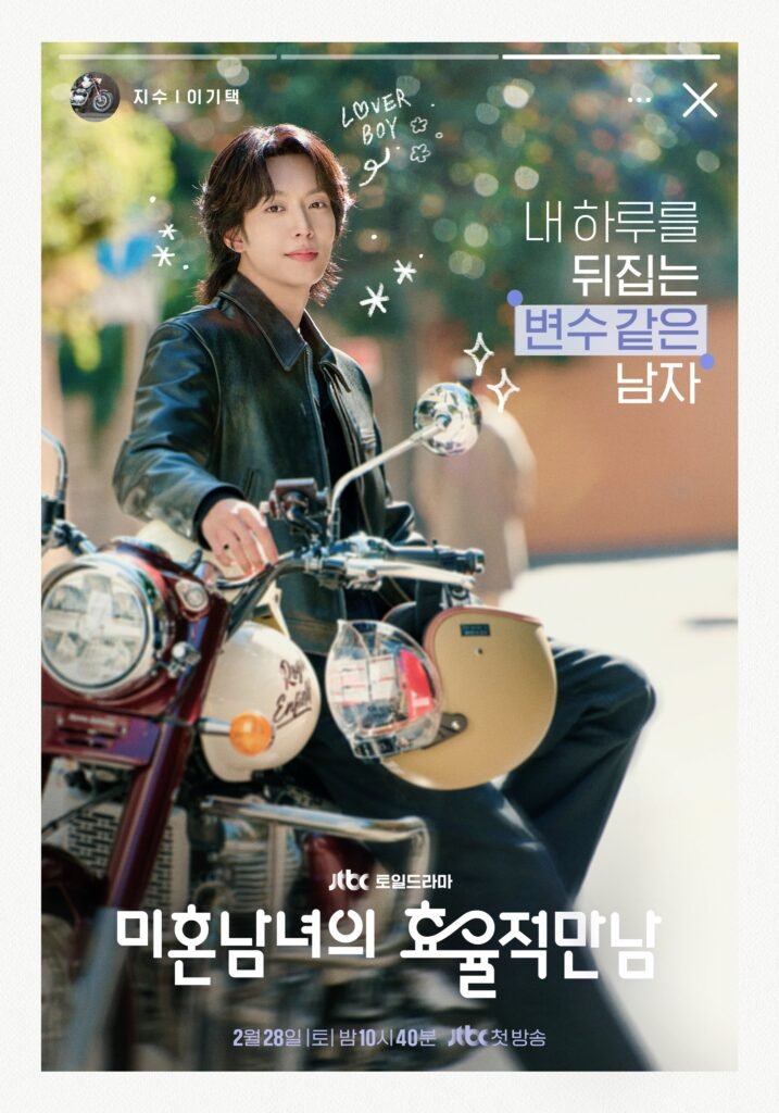 Meanwhile, Lee Ki Taek portrays Shin Ji Su, exuding a free-spirited and unpredictable energy. Sitting on a motorcycle in a rider jacket, his confident gaze and the tagline “The unpredictable man who turns my day upside down” suggest he will bring unexpected excitement into Lee Ui Yeong’s life.