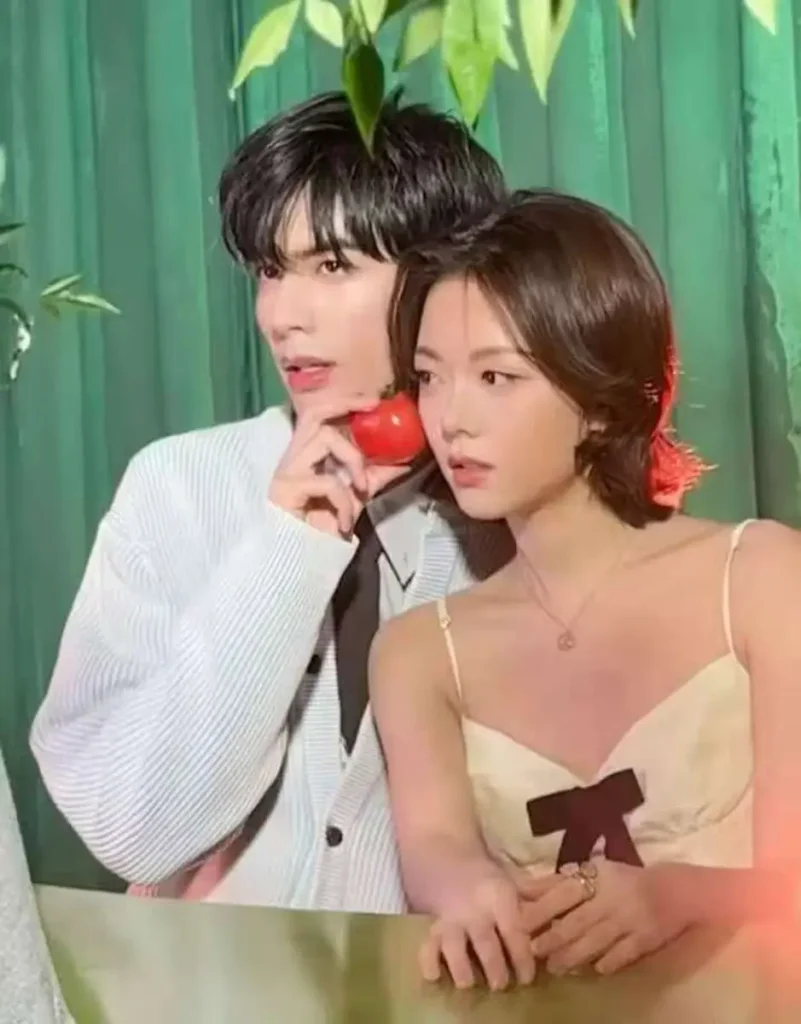 Song Weilong is seen wearing a simple shirt while holding a tomato, a detail that adds a playful and refreshing touch to the composition. His relaxed expression complements the clean styling, giving the photos a modern yet approachable feel. Zhao Jinmai appears equally at ease, and when they embrace, the interaction comes across as sincere and effortless.