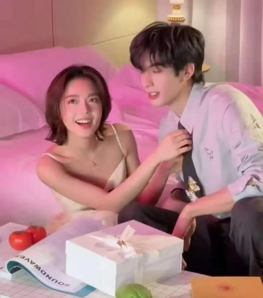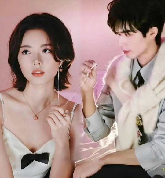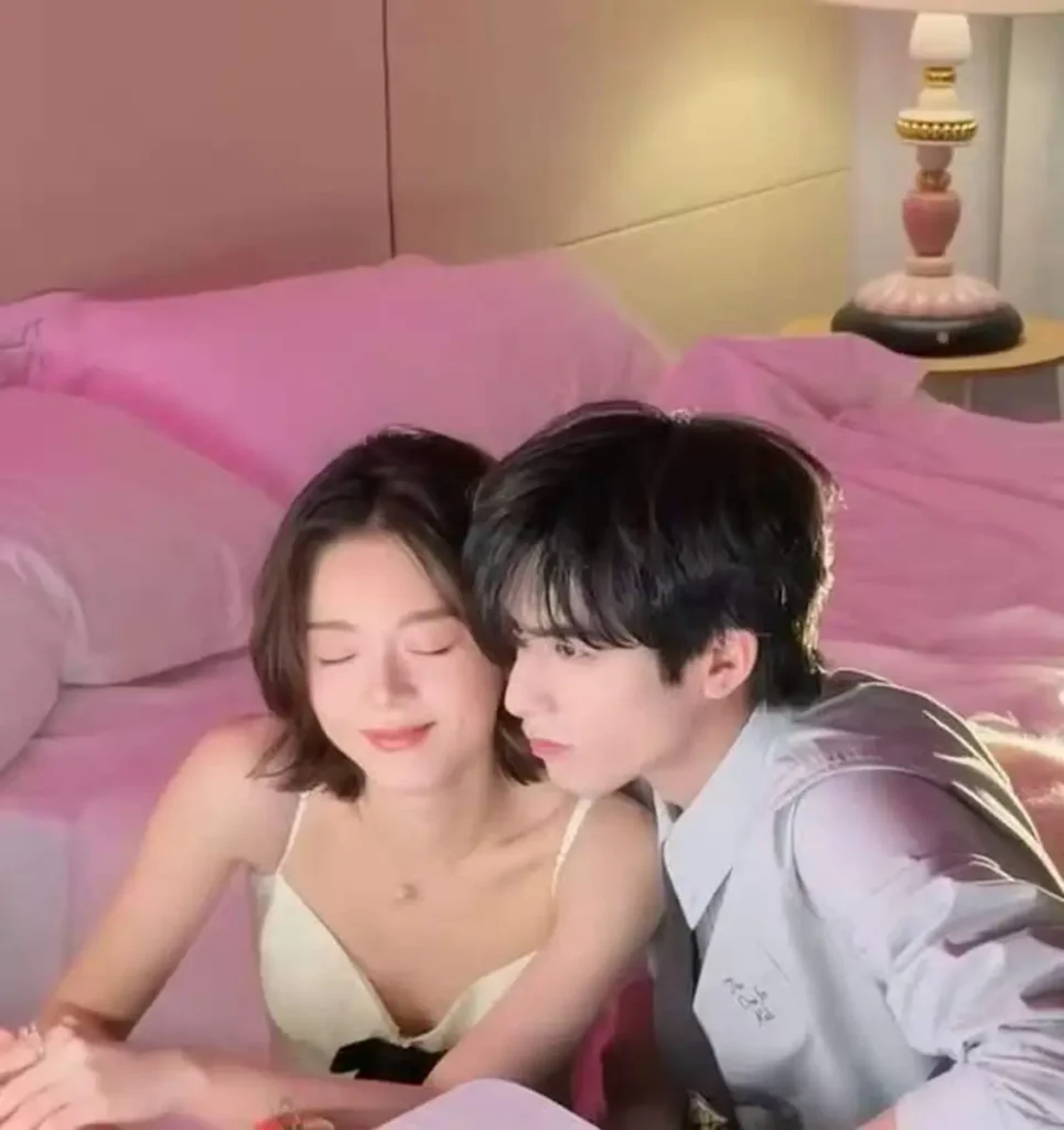 In several frames, they lean close with their faces gently touching, even resting their heads together with eyes closed. The subtle gestures convey a sense of comfort and familiarity, allowing the chemistry between them to feel natural rather than staged. The soft pink tones in the background enhance the overall sweetness of the scene.
