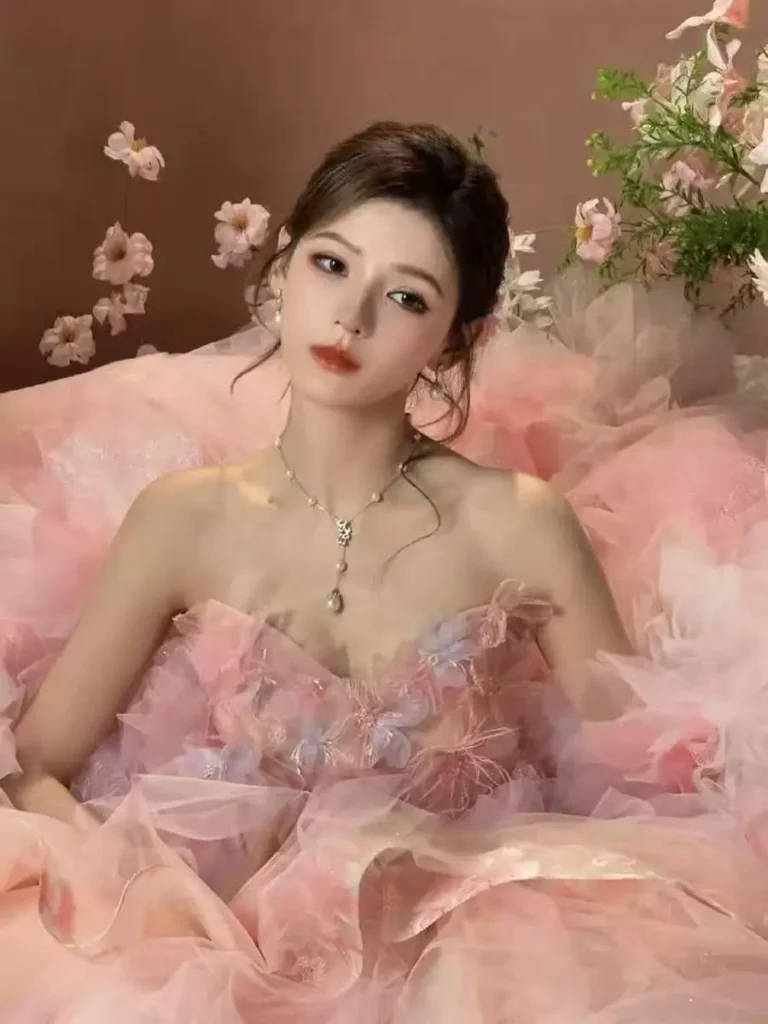 The flowing princess-style dress enhances the dreamy atmosphere, while a pearl necklace resting gently along her collarbone adds a subtle yet striking touch of refinement. The overall look balances sweetness with quiet elegance.