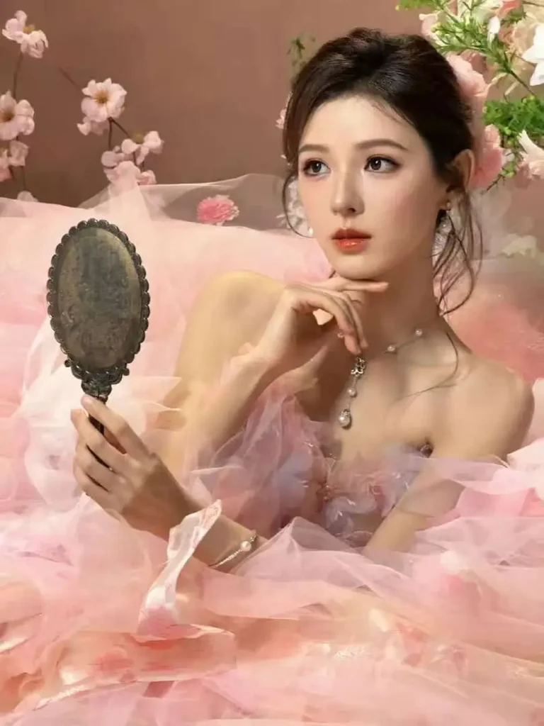 In one image, Zhang Yuxi gazes thoughtfully with her chin resting on her hand, her clear eyes conveying a calm and expressive presence. In another, she holds a vintage mirror as her airy gown drifts softly around her. A separate frame shows her reclining among flowers, serene and composed, reinforcing the gentle mood of the shoot.