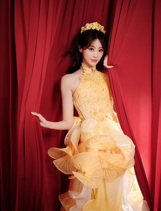 In the released visuals, Zhu Xudan appears in a flowing golden-yellow tulle gown set against a retro backdrop of red curtains and warm golden lighting. The interplay between luminous tones and soft textures creates a layered and celebratory aesthetic. The airy silhouette of the dress enhances movement within the frame, balancing traditional charm with stage-ready sophistication.