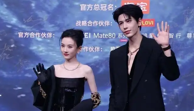 Zhang Linghe appeared in a tailored black couture suit, the structured silhouette highlighting his poised and composed image. Subtle jewelry accents added refinement without overpowering the minimalist aesthetic. Song Zuer, meanwhile, chose a fitted black gown complemented by understated diamond accessories, balancing elegance with a confident, radiant presence. Though unified in color, their distinct temperaments — cool restraint and vibrant sophistication — created a dynamic visual contrast.