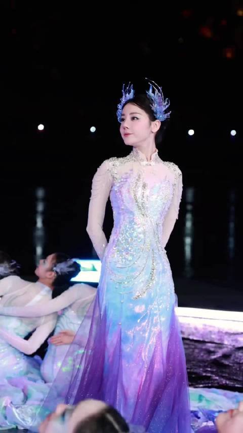 Her costume featured a gradient, flowing gown that incorporated elements inspired by river patterns and traditional Shu brocade. Under the stage lighting, the ensemble conveyed a sense of movement and elegance. Her makeup remained soft and luminous, balancing her distinctive features with a gentler aesthetic. A wet-hair styling choice complemented the water-themed backdrop, contributing to a cohesive visual presentation.