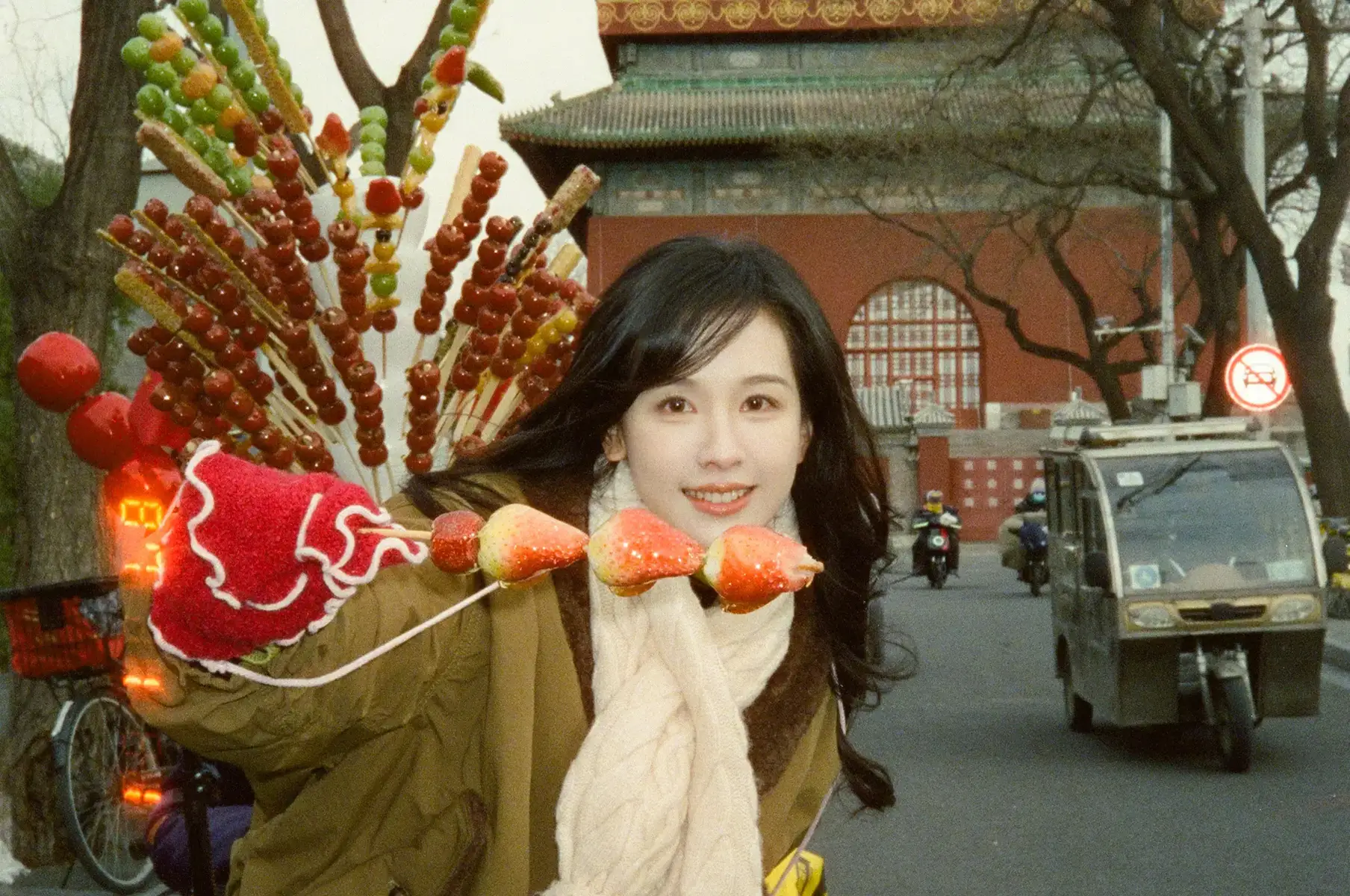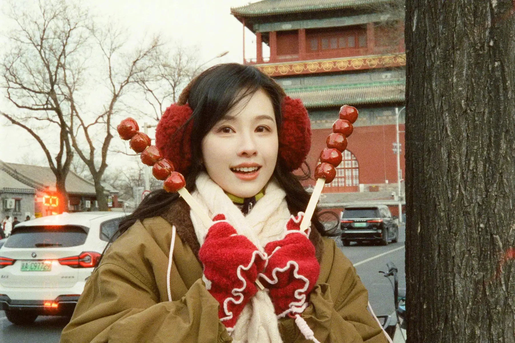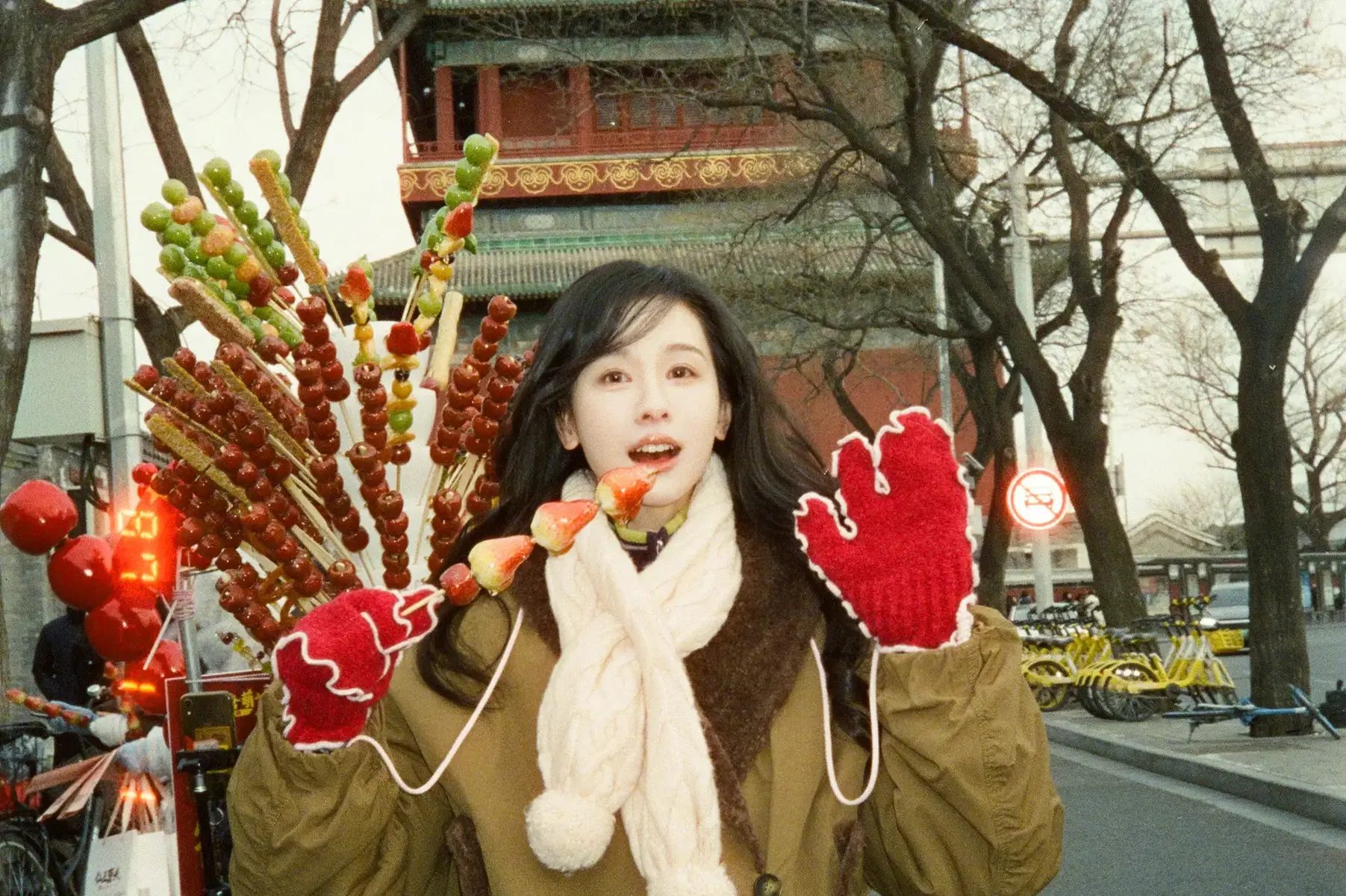 On February 22, Chen Duling released a set of casual holiday photos. In the images, she poses in front of the Drum Tower, holding a stick of candied hawthorns, adding a playful touch to the winter city backdrop.