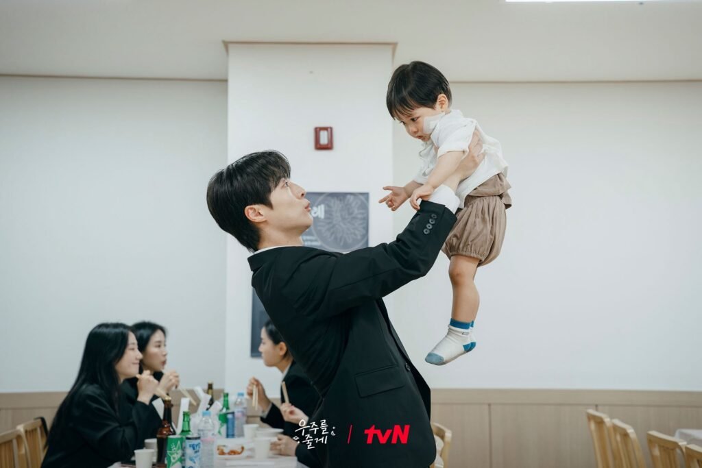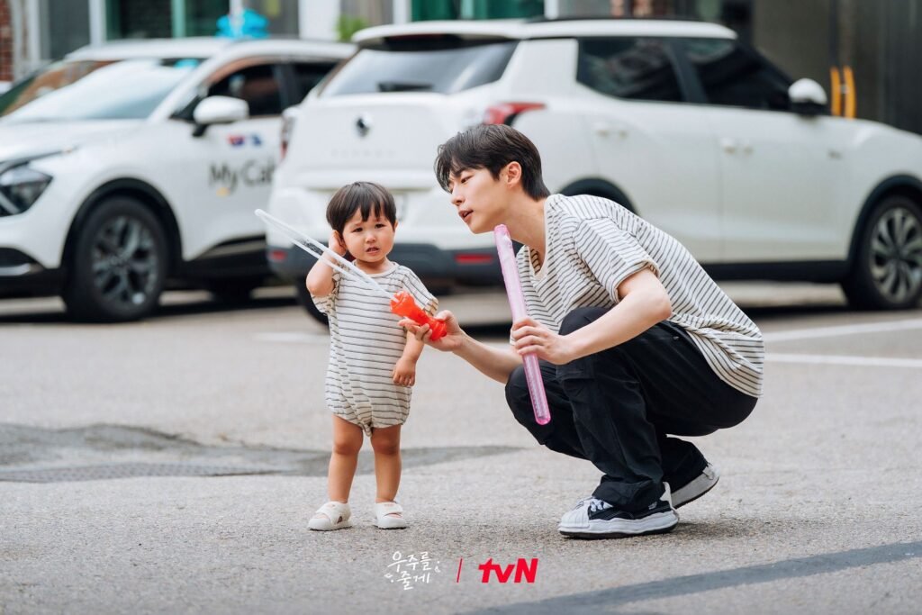 The newly revealed stills highlight Bae In Hyuk’s affectionate interactions with child actor Park Yoo Ho, who plays Woo Joo.