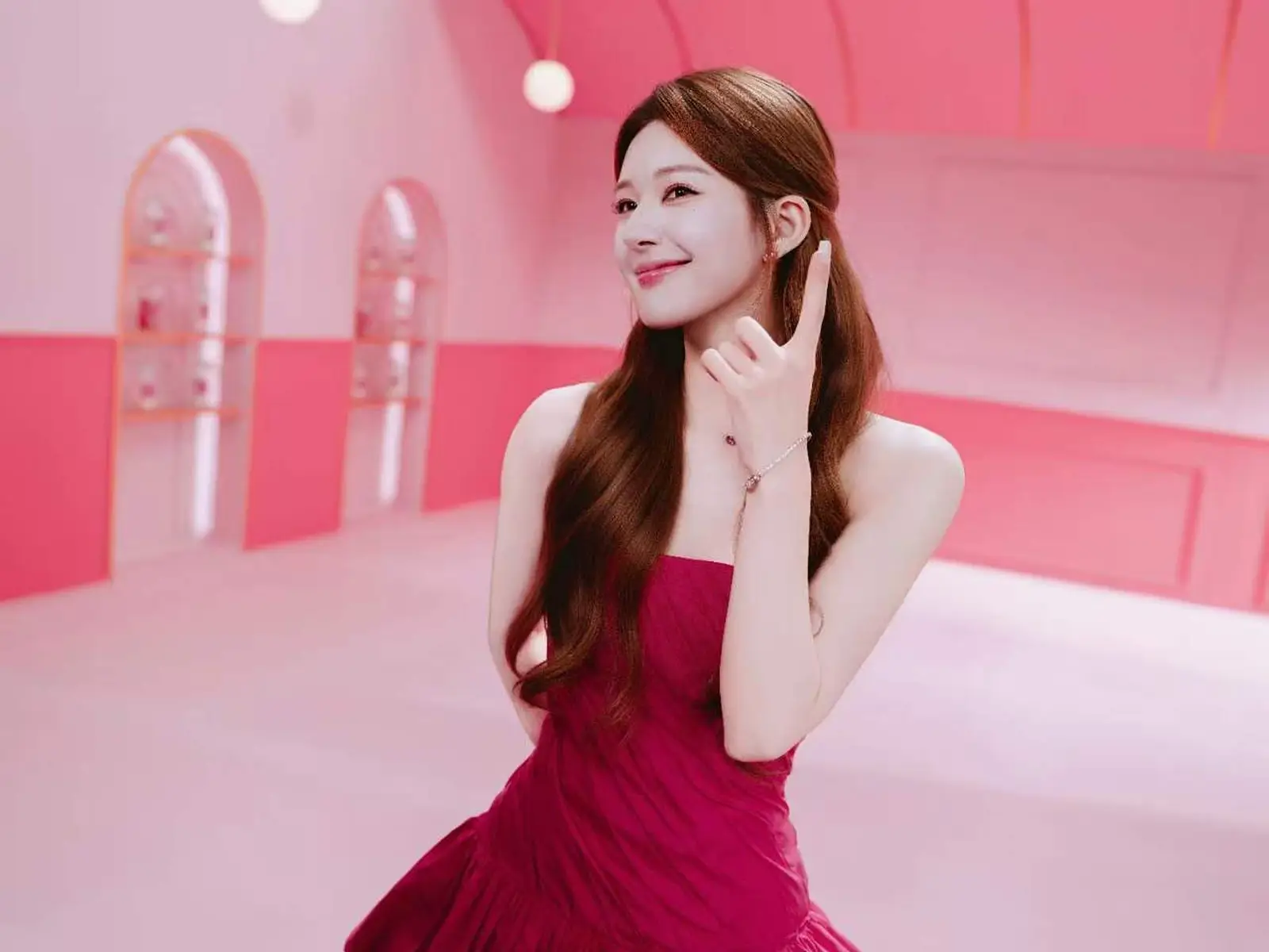 The rose-pink strapless gown immediately captures attention. The bold hue adds brightness and vitality, enhancing her complexion and bringing a dynamic presence to the frame. The clean neckline and structured silhouette keep the look polished rather than ornate. By choosing a minimalist cut, the focus remains on color, posture, and expression. Her half-up hairstyle introduces balance, maintaining a fresh and approachable feel while allowing her long curls to frame her face naturally.