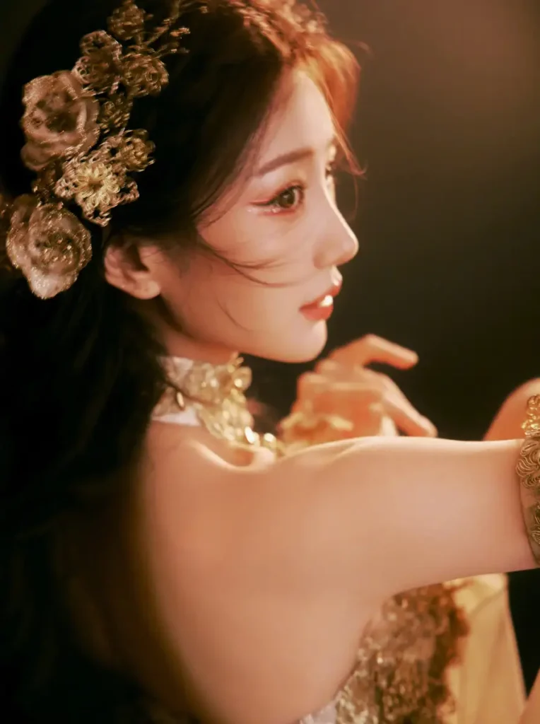 Actress Mao Xiaotong has unveiled a new series of photos featuring a striking gilded look that highlights her refined and graceful presence. In the newly released images, Mao Xiaotong appears in an intricately embroidered sheer gown accented with a golden headpiece, presenting a visual that blends classical grandeur with delicate charm. Holding an umbrella as she dances, she captures a sense of traditional Eastern elegance, her movements light and fluid against the ornate styling.
