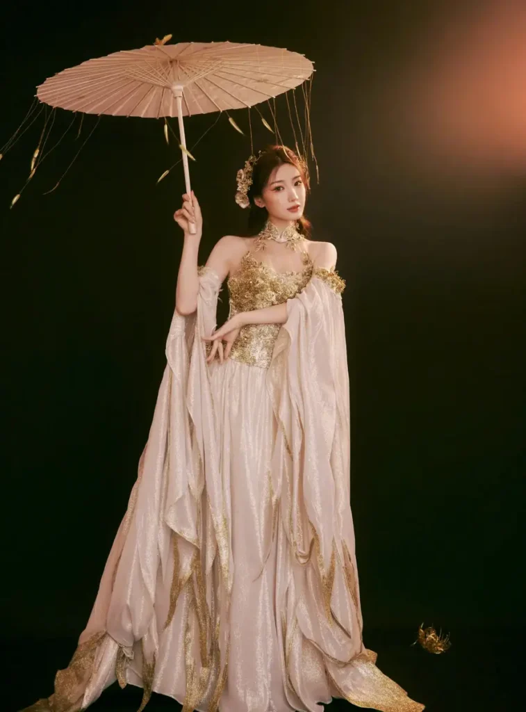 Actress Mao Xiaotong has unveiled a new series of photos featuring a striking gilded look that highlights her refined and graceful presence. In the newly released images, Mao Xiaotong appears in an intricately embroidered sheer gown accented with a golden headpiece, presenting a visual that blends classical grandeur with delicate charm. Holding an umbrella as she dances, she captures a sense of traditional Eastern elegance, her movements light and fluid against the ornate styling.