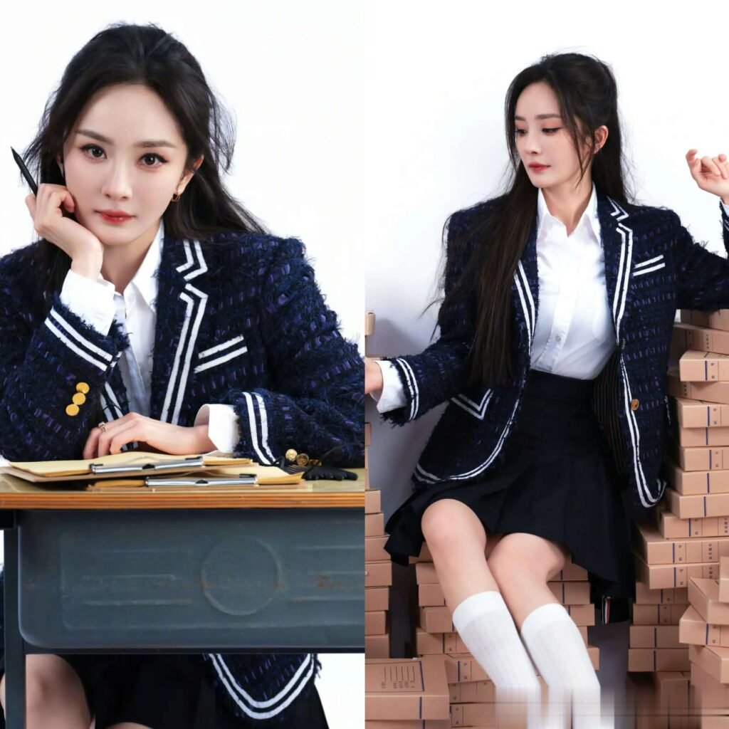 By contrast, Yang Mi appeared at a gaming finals event wearing a plaid mini skirt styled with white knee-high socks, a combination commonly associated with school-inspired aesthetics. From a technical standpoint, the outfit maintained balanced proportions and highlighted her well-maintained physique. However, the stronger reliance on recognizable “schoolgirl” signifiers made the styling feel more performative. When live-stream footage circulated alongside polished promotional images, online commentary shifted toward examining the gap between curated visuals and real-time appearances. The debate did not focus solely on age but on intention: whether the look represented playful reinvention or an insistence on preserving a narrowly defined youthful label.