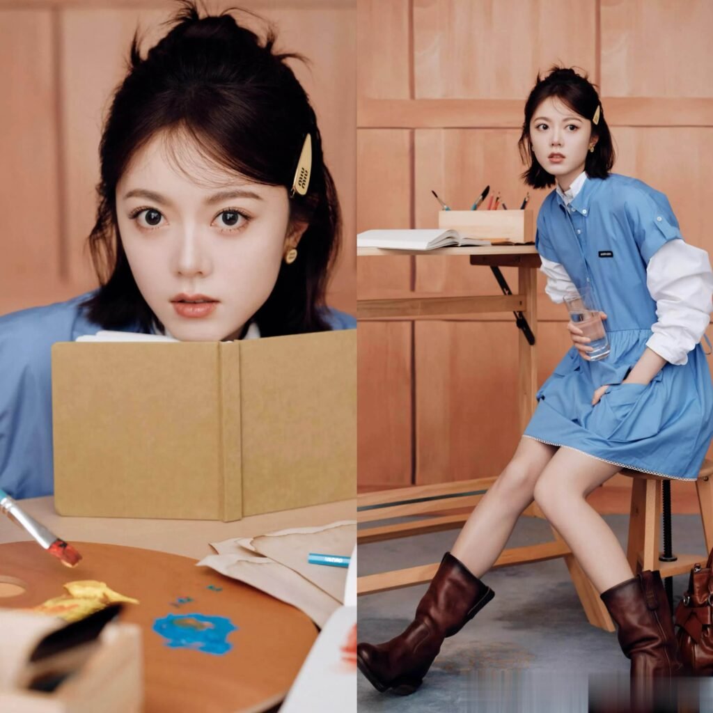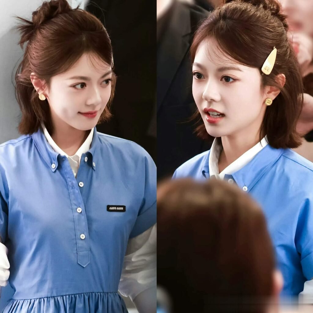 At a recent MIU MIU early spring showcase, Zhao Jinmai appeared in a blue shirt dress paired with a short haircut and minimal makeup. The look was deliberately understated, relying on clean tailoring and soft color tones rather than heavy embellishment. Importantly, the styling did not attempt to exaggerate youthfulness; instead, it aligned naturally with her age and public persona. The absence of excessive retouching in circulating images further strengthened the perception of authenticity. Her smile lines and spontaneous expressions were interpreted not as flaws but as markers of vitality. In this context, “youth” was not constructed through costume symbolism but conveyed through coherence between the actress’s stage of life and her visual presentation. The fashion strategy surrounding Zhao Jinmai emphasized effortlessness, allowing the brand’s campus-inspired setting to complement rather than overpower her image.