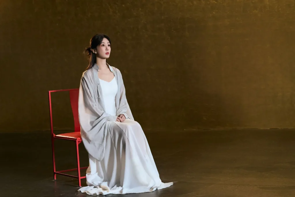 Another set of images shows Yang Zi embracing a more refined style while seated with her hair elegantly tied up. Dressed in a modernized Chinese-style sheer garment, she exudes a composed and dignified presence. The outfit blends traditional design elements with contemporary fashion, allowing Yang Zi to present a poised and graceful image while maintaining the softness that has become part of her public persona.