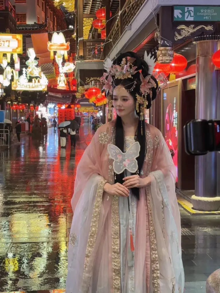 Another set of images shows the actress carrying a red lantern as she walks beneath rows of glowing lights. The warm tones of the lanterns and the gentle colors of her pink hanfu complement each other, emphasizing a soft and graceful aesthetic often associated with classical Chinese culture.